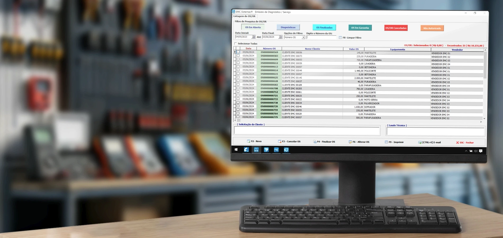 Gerenciamento de diagnósticos e ordens de serviço (OS).